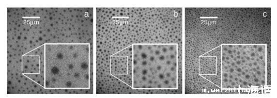 图3:DSPC/DMPC与(a)40、(b)50和(c)60 mol%DSPC的混合单分子膜。放大区尺寸为2525 mm2。