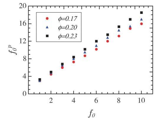 由于点偶极子模型的简单性,值得寻找两个模型之间的对应关系。为此,我们确定了一组f0在三个不同面积分数下的有效相互作用强度f p0。对于感兴趣的参数范围,可以在图10中看到f p0和f0之间的关系。该图有助于选择适当的f p0,以便通过仅基于更简单的点偶极子模型进行模拟来计算单层的结构特性。或者,如果实验对相关函数由点偶极子近似建模,则sffi ep的值可以使用根据该图估计的相应f0计算。