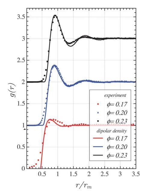 图9使用偶极密度和点偶极相互作用从BD模拟中获得的径向分布函数。选择点-偶极相互作用强度f p0,使偶极密度模型的相应g(rmax)与表2中的参数相匹配。当f=0.17、0.20和0.23时,得到的f p0值分别为3.0、6.6和8.2[kBT/Reff]。为了清晰起见,数据已垂直移动。
