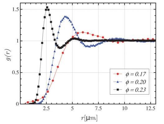 图5显示了三个实验系统的径向分布函数。在所有情况下,g(r)类似于液体,显示出明确的第一峰(在rmax处),其表征了第一配位壳层,即最近邻。此外,对于f=0.20和f=0.23的系统,观察到与第二配位壳对应的标记的第一最小值和第二最大值。由于“强”排斥作用,最近邻距离远大于平均磁畴直径。因此,硬核斥力不是结构的决定因素,系统的特征长度是平均几何距离rm=r 1/2。