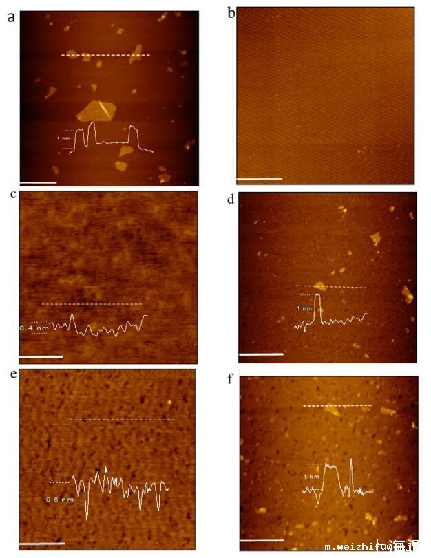 图5.新切割云母表面上的AFM图像(比例尺=1μm):(a)干燥后的一滴GO分散液;(b)LB膜在空气中不沉积脂质的对照实验−GO-水界面;(c)从空气中转移的DODAB LB膜−纯水界面;(d)从空气中转移的DODAB LB膜−GO-水界面;(e)从空气中转移的DSEPC的LB膜−纯水界面;(f)从空气中转移的DSEPC的LB膜−转到水界面。所有脂质LB膜在20 mN/m的恒定表面压力下转移。