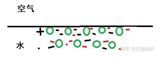 但是问题来了。水面的这一排分子,上面没有水分子了。于是对着空气的这一面,电荷没有办法被抵消了。于是电荷就开始乱七八糟了。但是整体上还是平衡的。