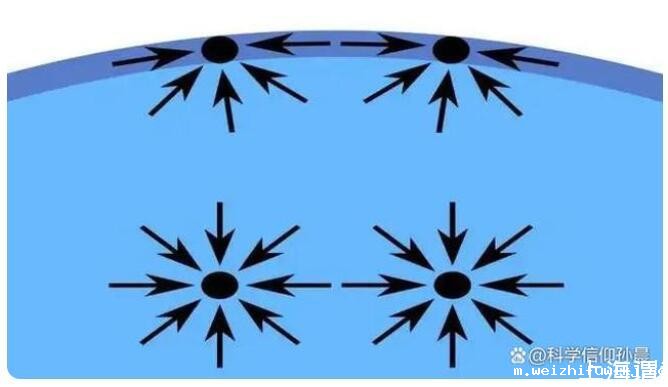 水滴要变成一个完美的球体,而要想变成一个完美的球体就必须依靠一个作用在表面上的力,这个力就是“表面张力”。