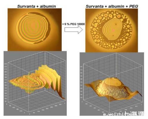 当通过Survanta和白蛋白添加到混合FFs中时,葡聚糖不会改变膜的性质。然而,当FFs中包含PEG 10000时,富含白蛋白的厚膜分解成更小的厚“岛”,岛之间有薄的(h=17 nm)黑色区域(图4)