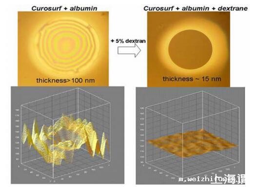白蛋白抑制外源表面活性剂制剂在空气/水界面的表面活性。当BSA出现在膜液相中时,Curosurf和Survanta都失去了在单层中保持低最小表面张力和形成黑色泡沫膜的能力。