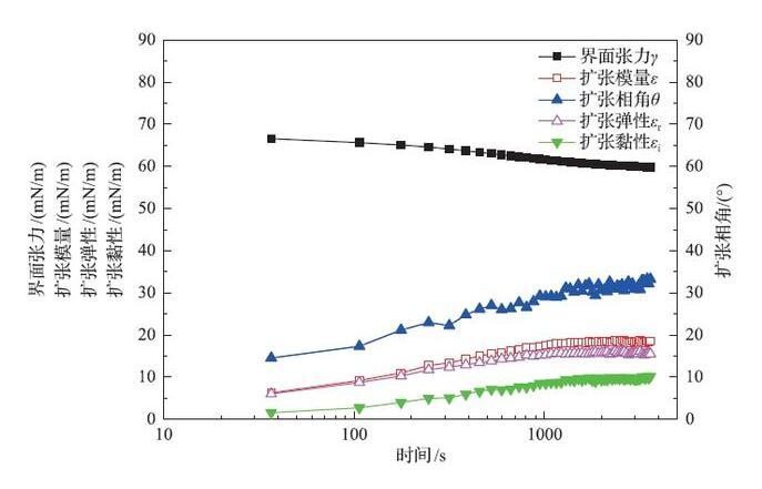 表面活性剂溶液的动态界面张力、扩张模量、扩张相角、扩张弹性和扩张黏性随时间变化曲线