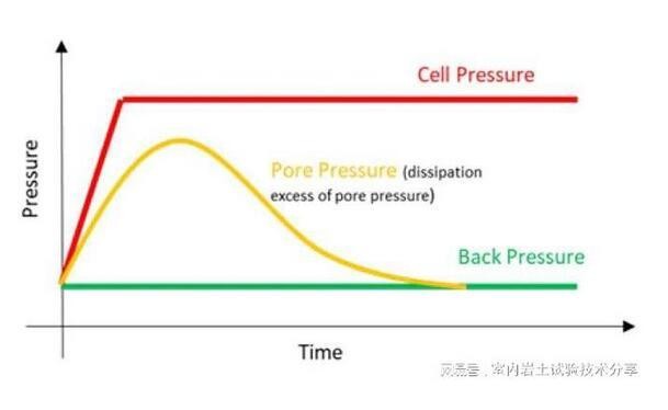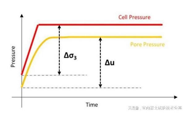在此过程中,计算孔隙压力系数B以确定饱和度。重复这些步骤,直到样品饱和。大多数标准规定,大于0.95的B值表明标本已充分饱和。B值计算为一个比值其中∆u=孔压变化∆σ3=围压变化;