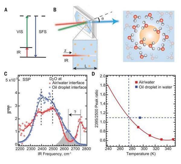 氢的疏水性代表了一种基本的物理性质,它决定了水介质中的各种过程,如蛋白质折叠、自组装和聚集。亚微米级疏水油滴或水微粒是了解疏水作用机理的重要模型系统。然而,这些界面的电荷和结构都有很大的争议。虽然电荷转移模型表明水是油滴电荷存在的关键,但油滴旁边的水的结构同样存在争议。因此,疏水液体材料旁边的水的结构仍然是未知的。