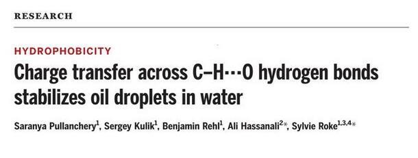 近日,洛桑联邦理工学院Saranya Pullanchery及其合作者在Science上发表文章“Charge transfer across C–H···O hydrogen bonds stabilizes oil droplets in water”,揭示了水与分散在水中的疏水液滴接触时的结构,并研究了负电荷的来源。结果表明:(1)氢键网络在油-水界面处比在空气-水界面处更强。(2)电荷从水O原子转移到油中的C-H基团。(3)界面处水向油分子的电荷转移是水中油滴负电荷的来源,并对其稳定性起着重要作用。