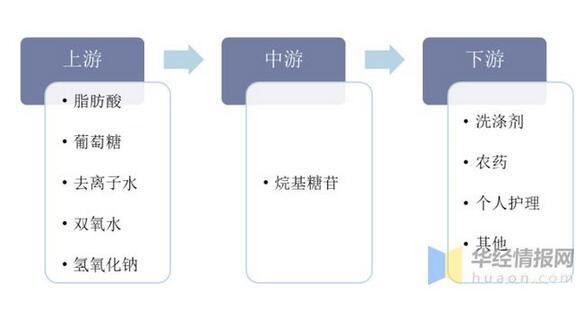从产业链来看,烷基糖苷产业链由上游原材料、中游生产制造、下游应用领域三部分构成。产业链上游原材料主要包括脂肪酸、葡萄糖、去离子水、双氧水、氢氧化钠;产业链下游主要应用于洗涤剂、个护、农药等领域。