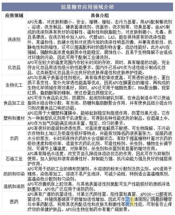 烷基糖苷(简称APG)是一种由葡萄糖的半缩醛羟基与脂肪醇羟基在酸催化作用下脱去一分子水而得到的一种化合物。APG具有很多优良的性能,如泡沫丰富、刺激性低、无毒、可完全生物降解等,在不同领域的应用越来越广泛,包括洗涤剂、化妆品、生化、食品添加剂、农药增效剂等。具体应用领域及介绍如下: