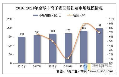 作为新型非离子表面活性剂的APG是在1893年由德国科学家Emil Fisher首次报道合成。非离子表面活性剂主要包括:脂肪醇聚氧乙烯醚、聚醚(含减水剂大单体)、脂肪胺醚、脂肪酸聚氧乙烯酯、烷基酚聚氧乙烯醚、烷醇酰胺和烷基糖苷等系列产品。全球非离子表面活性剂从2016年的150亿美元增长至2019年的170亿美元,年均复合增长率达4.26%,预计2021年将达到198亿美元市场规模。