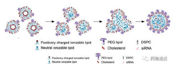 在有siRNA存在的情况下,最初是在紧密相连的脂质单层之间形成包含siRNA的小囊泡;随着pH值的升高,类似于不含siRNA的LNP,可电离脂质电位的中和会诱导脂质颗粒间的融合,这个过程受到复合物中PEG脂质、DSPC和胆固醇的相分离限制;有科学家提出,这些脂质沉积在表面单层,抑制脂质颗粒进一步融合。值得注意的是,高浓度乙醇(体积比不小于25%)会导致除单个脂质分子的高交换率(与siRNA复合的阳离子脂质除外),从而使得快速形成平衡结构;还需要指出的是,必须要有部分DSPC和胆固醇被分割在外单层,并且在pH=4时能维持更小结构的稳定,因为在含有1.5 mol % PEG脂质且没有DSPC或胆固醇的体系中能观察到非常大的微米级系统;随着pH的升高,纳米颗粒经历的过程与不含siRNA时LNP的情况基本相同;可电离脂质向中性形式转化的过程更利于增加在LNP内核中的融合和沉积。