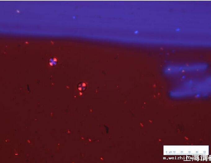 红色的部分为墨水残余物的涂片,蓝紫色是载玻片本身在偏光镜下的颜色。图中可以看到两个标准的马耳他十字,基本上能够验证“sheen是结晶导致”这一说法