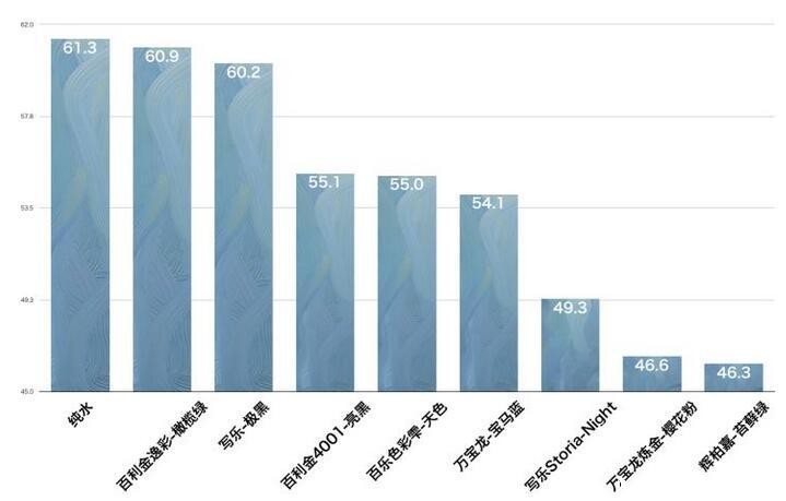 1.达到60mm接近纯水的【高流动性组】,代表样本为【百利金逸彩橄榄绿】、【写乐极黑】;