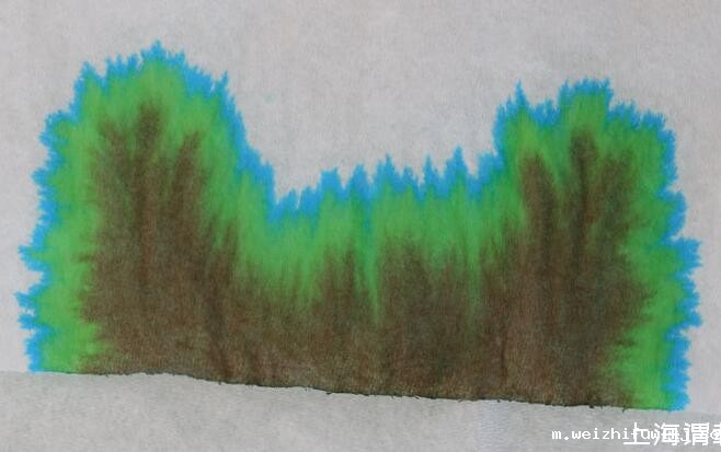 墨水从纸巾的下端浸入,按照扩散速度不同,被分成了最慢的棕色,中间的绿色和最快的蓝色。其实最最外层还有无色的液体,干了之后图里面看不见了