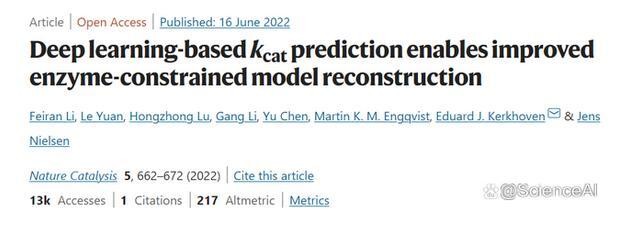 该研究以「Deep learning-based kcat prediction enables improved enzyme-constrained model reconstruction」为题,于2022年6月16日发布在《Nature Catalysis》。