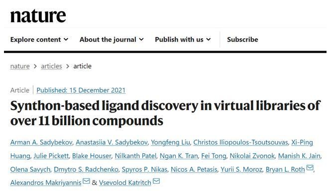 2021年12月15日,美国南加州大学、东北大学和北卡罗来纳大学教堂山分校的研究团队合作,在Nature发表了题为:Synthon-based ligand discovery in virtual libraries of over 11 billion compounds的研究论文。