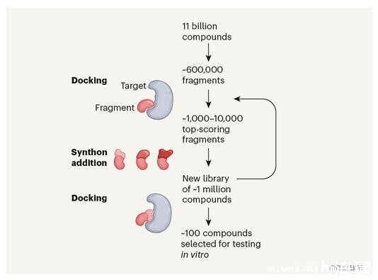 通过重复对接和添加合成子的步骤,筛选几百万个化合物来确定hits。随着每一次迭代,每个化合物的大小都会随着分子变得更加完整而增加。