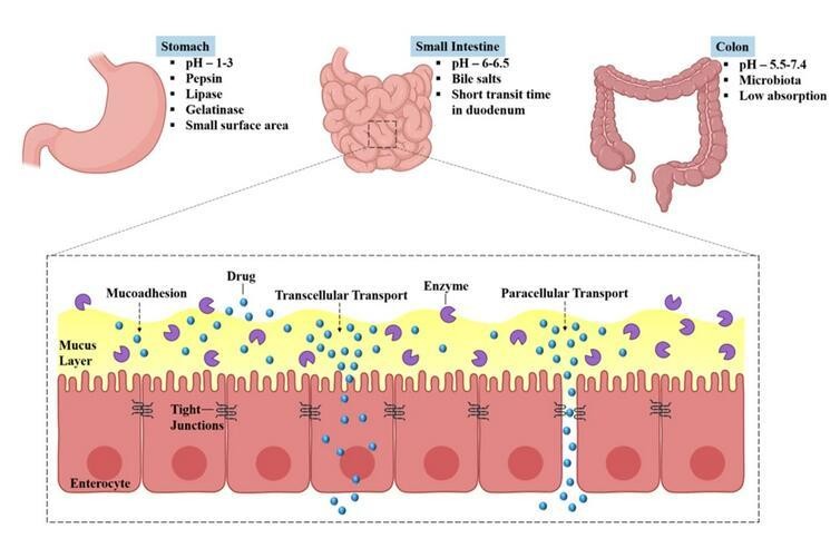 口服药物在经历胃部的生理障碍后到达小肠。在小肠(十二指肠)的入口处,胰酶会引发几种酶促转化,这些酶还可能导致首过代谢,从而导致药物生物利用度降低。因此,口服药物必须克服这些生理学障碍。