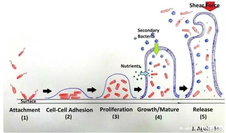 控制生物膜或微生物频繁超标的关键在于清除由胞外多聚物构成的生物膜。当系统中已出现生物膜时,应首先清除对微生物起保护作用的生物膜,使微生物直接暴露于环境中,再对设备表面进行消毒。生物膜可以为微生物提供对消毒剂的抗性,直接使用消毒剂效果不理想。且如果仅仅杀灭生物膜下微生物,而无法清除生物膜时,浮游微生物可不断粘附于生物膜上,频繁造成系统中微生物超标等质量问题。