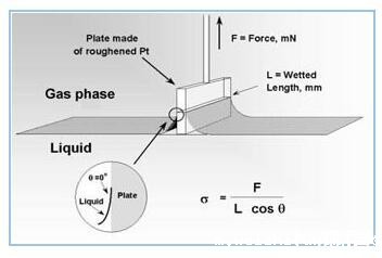 威廉米平板法威廉米平板法(Wilhelmy Plate method):这是一种很普遍的测量方法,尤其适用于长时间测量表面张力的测量。测量的量是一块垂直于液面的平板在浸湿过程中所受的力。
