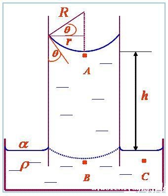 毛细管升高法毛细管升高法:当液体与毛细管管壁间的接触角小于90度时(浸润的),管内的液面成凹面,弯曲的液面对于下层的液体施加负压力,导致液面在毛细管中上升,直到压力平衡为止。通过测量液面升高的高度,及已知毛细管内径和液体与毛细管管壁间的接触角(通常默认为是0),就可计算出表面张力。这是一很经典及直观的方法,所以经常被用来作为教学示范和学生实验。