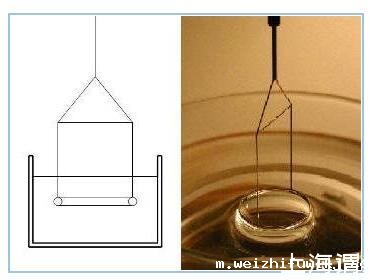 挂环法(Du Nouy Ring method):这可能是测量表面/界面张力的最经典方法,文献上报道的许多液体的表/界面张力值是用这一方法测得,它甚至可以在很难浸湿的情况下被使用。用一个初始浸在液体的环从液体中拉出一个液体膜(类似肥皂泡),同时测量提高环的高度时所需要施加的力。
