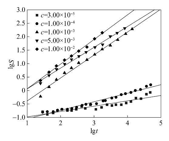 图4不同浓度表面活性剂溶液的lgS-lgt曲线图Fig.4lgS-lgtcurves of various aqueous