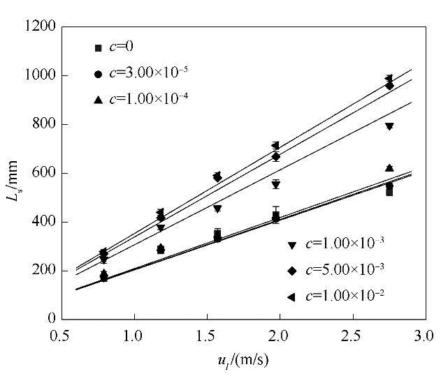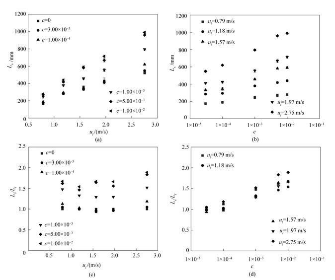 为了定量表征表面张力变化对射流破裂过程的影响,实验测量了含表面活性剂射流的射流破裂长度。射流破裂长度定义为喷嘴出口至射流首次发生破裂处的距离。图6是含表面活性剂射流破裂长度随射流速度u l的变化趋势,其中L s(mm)表示含表面活性剂射流的射流破裂长度,L l(mm)为水的射流破裂长度。从图6(a)中可以看出,当表面活性剂浓度保持不变时,提高液体射流速度会增大射流破裂长度。从图6(b)中可以看出,当液体射流速度保持不变时,随着表面活性剂浓度的增大,射流破裂长度总体上呈现逐渐增大的趋势;射流速度越大,射流破裂长度增大的趋势就越明显。使用相同工况下水的射流破裂长度无量纲化含表面活性剂射流的破裂长度后,可以得到射流破裂长度比随射流速度以及表面活性剂浓度的变化趋势,如图6(c)、(d)所示。从图中可以看出,表面活性剂的加入显著增大了射流破裂长度比。在表面活性剂浓度不变时,提高液体射流速度对射流破裂长度比的影响并不显著。在射流速度保持不变时,提高表面活性剂浓度会导致射流破裂长度比的增大。