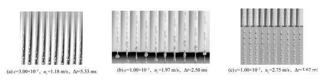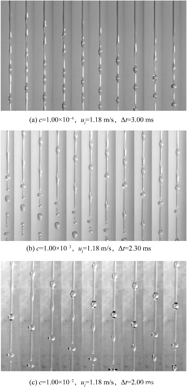 本文首先研究了不含气泡的表面活性剂射流破裂过程以探究表面张力变化对射流破裂特征的影响。实验使用高速相机记录了六种不同浓度表面活性剂溶液的射流破裂过程。实验获得的射流破裂过程如图5所示,其中Δt是相邻两张图片间的时间间隔。从图5中可以看出,虽然表面活性剂浓度并不相同,但射流的破裂过程在形态上是相似的。当液体射流离开喷嘴后,射流表面扰动迅速增长,表面波动在射流表面呈对称分布,这是射流破裂Rayleigh区的典型特征。随着表面波动的进一步发展,在射流方向上,射流表面形成瘤状结构,射流破裂发生在两个瘤状结构之间。