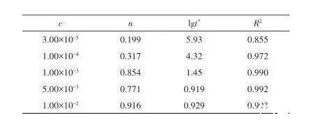 图4展示了不同SDBS浓度下lg S随lg t的变化规律,图中实线对应各浓度下动态表面张力的拟合曲线,此时图中时间t的单位为ms。从图中可以看出,拟合结果与实验数据吻合较好,拟合曲线能够较好地表征动态表面张力的时间演变趋势。拟合得到的系数见表1。