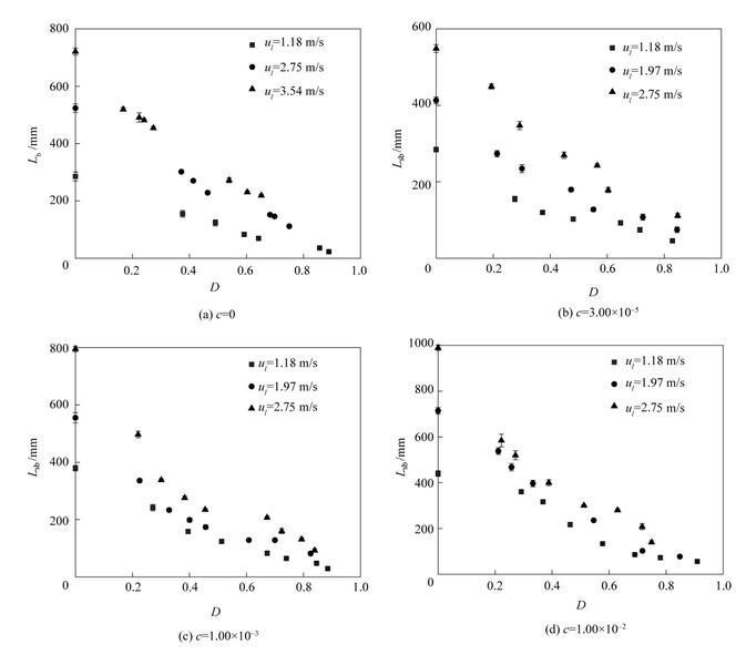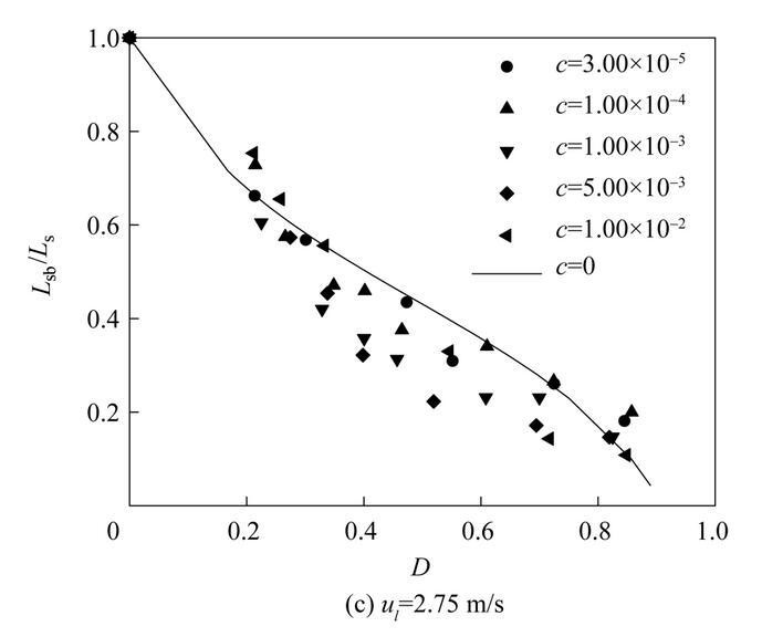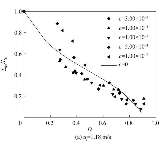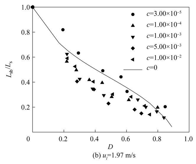 图11是不同浓度表面活性剂射流破裂长度L sb随气泡无量纲直径D=d b/d 0(d b为气泡直径)的变化。从图中可以看出,不同表面活性剂浓度下,射流破裂长度随气泡无量纲直径D的变化趋势是相似的。射流破裂长度随着气泡直径的增大逐渐减小;当气泡直径相同时,提高液体射流速度会导致更大的射流破裂长度。