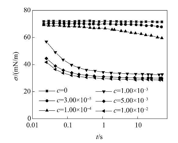图3不同浓度表面活性剂溶液的动态表面张力Fig.3Dynamic surface tension at various surfactant concentrations