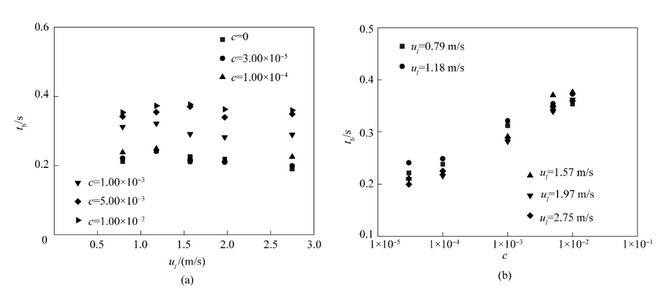 从图7(a)中可以看出,当表面活性剂浓度保持不变时,射流破裂时间几乎不随射流速度的改变而改变。在射流速度保持不变时,随着表面活性剂浓度的增大,射流破裂时间呈现逐渐增长的趋势。在实验参数范围内,射流破裂时间均小于0.4 s。考虑重力对液体射流的加速作用,液体射流实际破裂时间要小于0.4 s。
