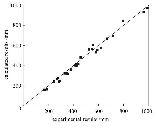 图9射流破裂长度实验测量值与拟合计算值的比较Fig.9Comparison between experimental results and calculated results