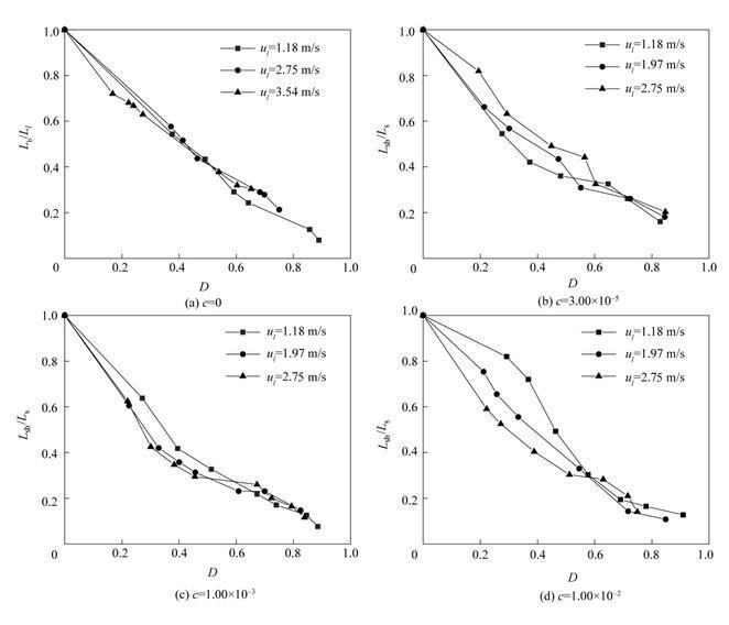 如图12所示,当气泡直径较大时,破裂长度比基本不随射流速度的改变而改变。这是由于此时气泡引起的射流速度扰动对射流破裂的影响占主导地位。在气泡直径较小时,当表面活性剂浓度c<1.00×10-2,不同射流速度下射流破裂长度比基本相同。当表面活性剂浓度c=1.00×10-2,破裂长度比随着射流速度的增大而逐渐减小。这可能与被削弱的Marangoni效应有关。由式(10)可知,液体射流速度越大,液体对流造成的表面活性剂表面吸附量减少的趋势越强,波峰波谷间的表面张力差值越小,Marangoni效应越弱,射流破裂长度增加的趋势越弱。因此,在气泡较小时,随着射流速度的增大,含气泡射流的破裂长度比逐渐减小。在表面活性剂浓度较小时,气泡的存在进一步减小了射流内部表面活性剂的浓度,从而使得不同射流速度下Marangoni效应的差别不明显,不同射流速度下射流破裂长度比基本相同。