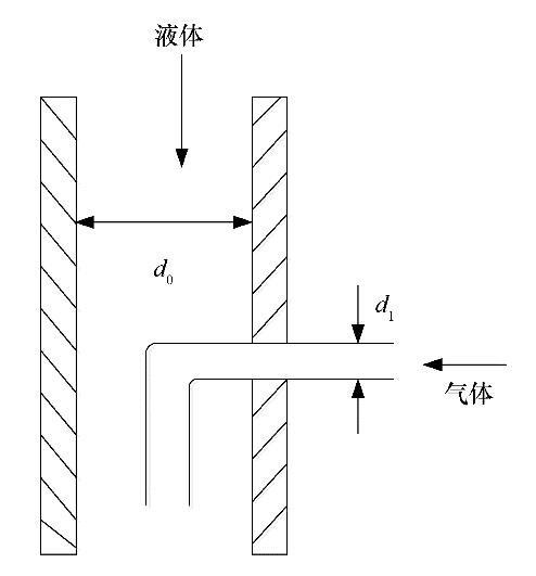 实验流程如图1所示。来自注射泵的气体通过充气通道进入喷嘴并在喷嘴内形成气泡,并与来自液体流量计的液体相混合形成气液混合物。该气液混合物离开喷嘴后,在不稳定波的作用下发生破裂,使用高速相机记录这一过程,并使用开源软件ImageJ分析处理得到的图片。实验通过控制注入喷嘴的气体流量从而得到不同液体射流速度下直径近似相等的气泡。实验使用的喷嘴如图2所示。其中,喷嘴内径d 0=2.96 mm,充气通道外径d 1=0.50 mm。