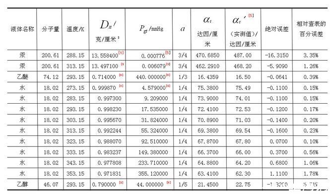 其中N0为阿伏伽德罗数,M为摩尔质量,Dit是液体的密度,Dgt是液体饱和蒸汽的密度,a为与液体种类相关的常量。为验证(1)式的正确性,对汞、乙醚、水、乙醇等实际液态物质的表面张力系数进行理论计算,并与实验实测值'相比较,列于下表【3】: