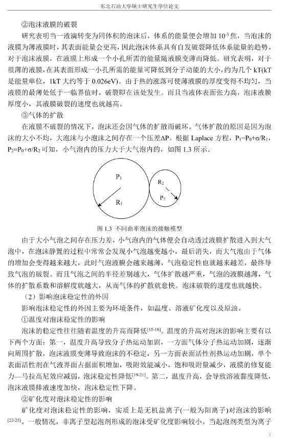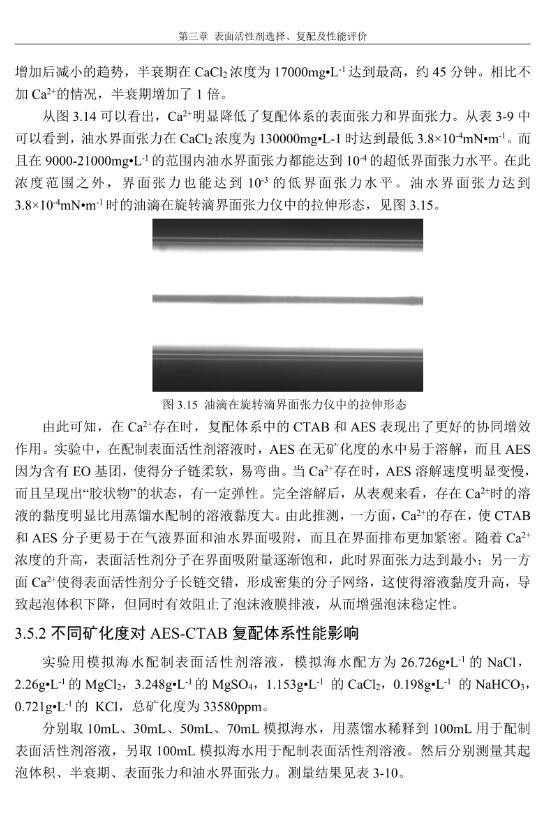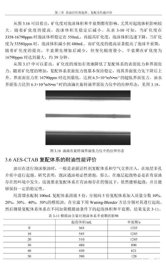 【摘要】:泡沫驱具有良好的驱油性能,在提高采收率方面备受关注。在泡沫驱油过程中,能够明显降低注入流体的流度,改善流度比,降低流体的相对渗透率,延缓注入流体的突破时间,封堵高渗层的大孔道,改变液流的方向,较好地实现封堵作用。但泡沫作为一种热力学不稳定流体,其稳定性受许多因素的影响,包括遇油快速消泡、在高温和高矿化度的情况下极易破裂等,泡沫稳定性已成为泡沫驱油时亟待解决的问题。另外,用于泡沫驱的泡沫体系很难兼具超低界面张力和稳定泡沫两种性能,而且文献报道对这方面的研究较少,这为本文提供了一个新的思路。实验室合成阴-非离子型表面活性剂十二醇聚氧乙烯醚硫酸钠(AES)。AES同时具有阴离子和非离子两种表面活性剂的性能,具有很好的泡沫性能和表面活性,同时与其它表面活性剂具有很好的相容性。最终确定的合成条件为:十二醇聚氧乙烯醚和氨基磺酸的摩尔比为1:2,反应温度为95℃,反应时间为60min。在合成AES的基础上,选择几种不同类型的表面活性剂进行复配,优选出泡沫性能和表面活性优良的体系,进行耐温、耐矿化度及耐油性能的评价。实验采用Waring-Blender法测量泡沫的起泡体积和半衰期,采用吊环法和旋转滴法测量复配体系的表面张力与油水界面张力。实验最终优选出泡沫性能与表面活性优良的AES-CTAB复配体系,并确定其最佳复配摩尔比为3:1,最佳总浓度为0.02mol·L-1。复配体系耐温200℃,耐质量分数20%的原油,矿化度增加可以提高复配体系的泡沫稳定性和表面活性。实验从气液比、泡沫注入量和温度三个方面对泡沫提高采收率的影响进行研究。最佳气液比为2:1,最佳泡沫注入量为0.6PV,泡沫采收率随温度的提高逐渐下降,在60-100℃范围内泡沫在水驱后提高采收率在30%以上。