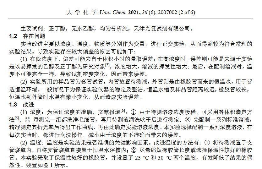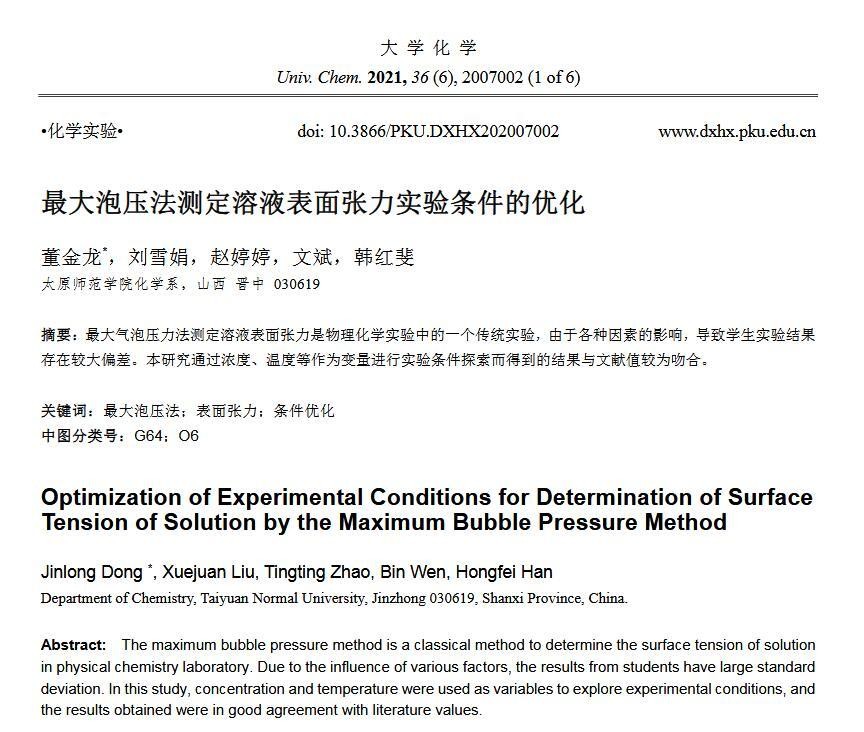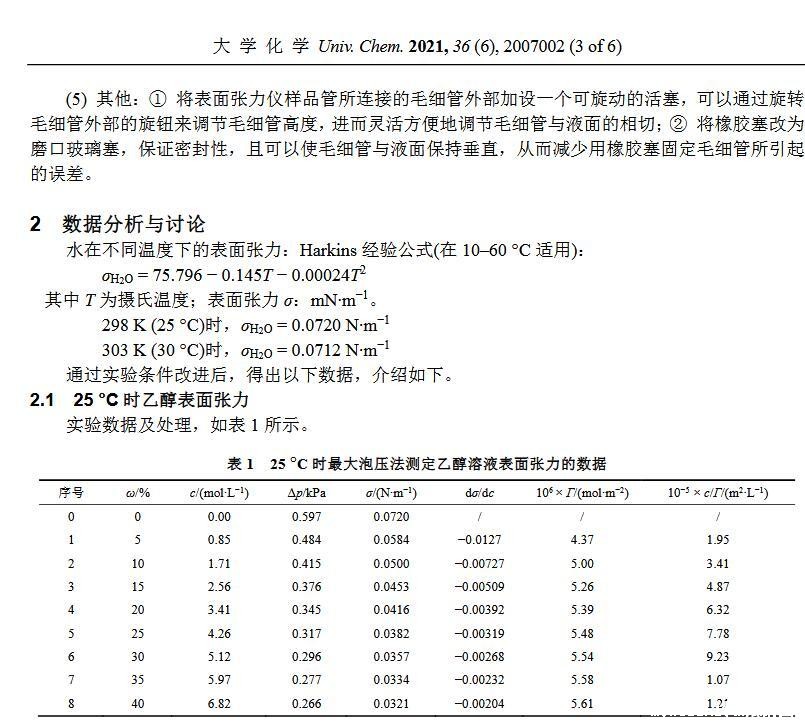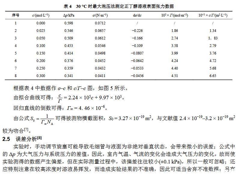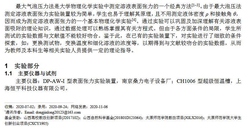 【摘要】:最大气泡压力法测定溶液表面张力是物理化学实验中的一个传统实验,由于各种因素的影响,导致学生实验结果存在较大偏差。本研究通过浓度、温度等作为变量进行实验条件探索而得到的结果与文献值较为吻合。