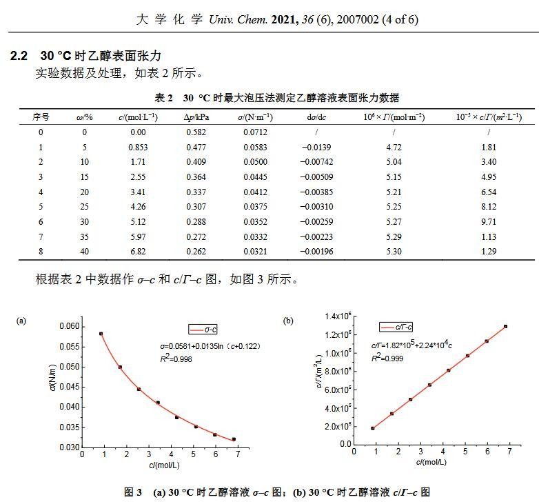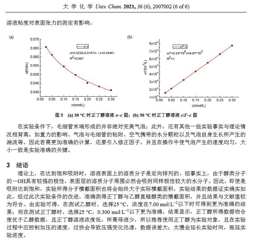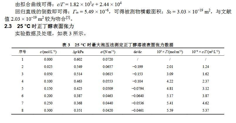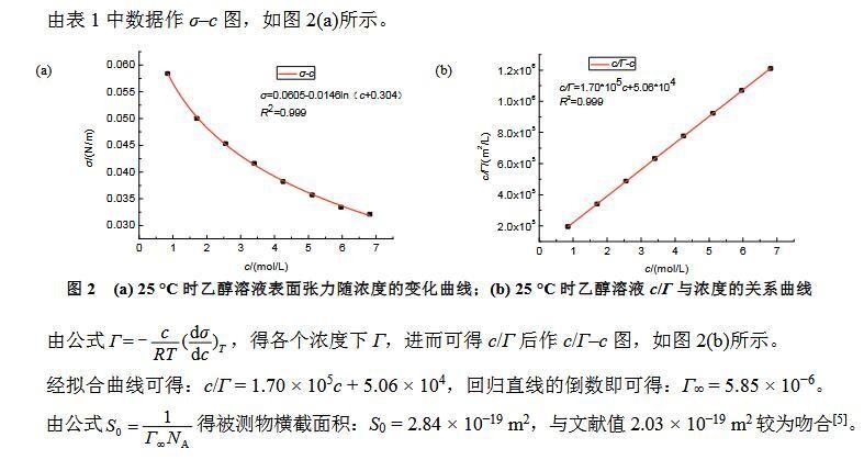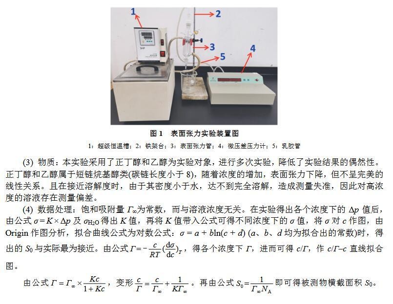 最大气泡压力法是大学物理化学实验中测定溶液表面张力的一个经典方法[1–3]。由于最大泡压法测定溶液表面张力实验装置较为简单,学生也易于理解其原理,且不用测定液体密度ρ和接触角θ,因而成为测定溶液表面张力的一个基本物理化学实验[4]。通过实验可以巩固及加深理解有关溶液表面吸附的理论知识,通过数据处理可以熟练掌握其有关方程式。但由于各方面条件的局限,学生所测试的实验数据与文献值不能较好吻合。鉴于此,在已有的实验装置下,对实验进行了细致的条件探索,如:更换测试物,变换温度和细化溶液的浓度等,以期得到与文献较吻合的实验数据,从而为教师及本科生等相关实验人员提供一定的理论指导。