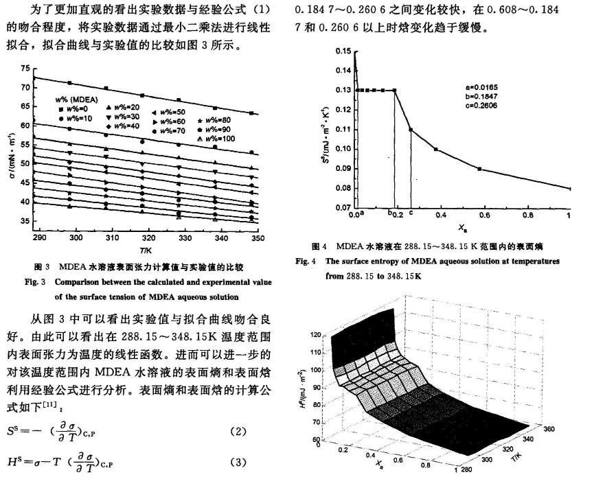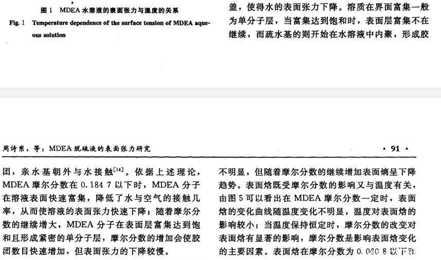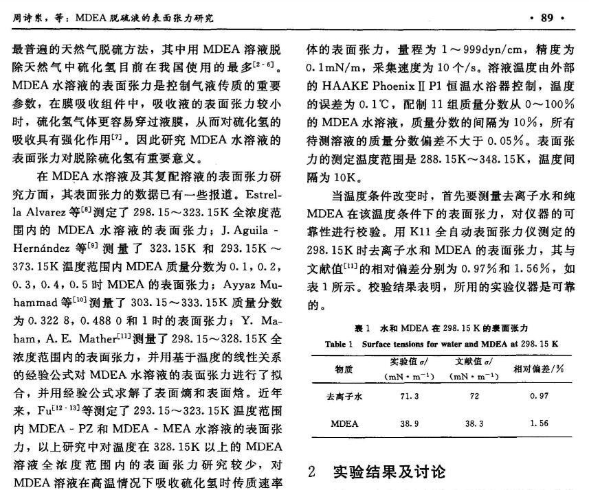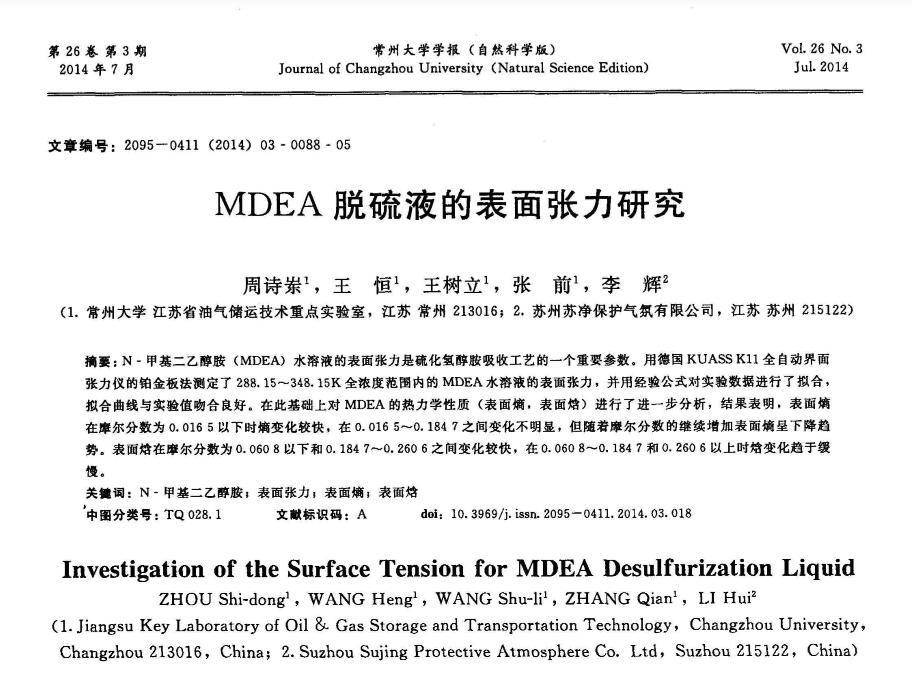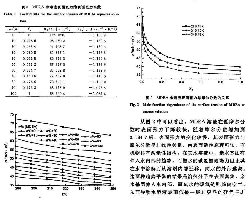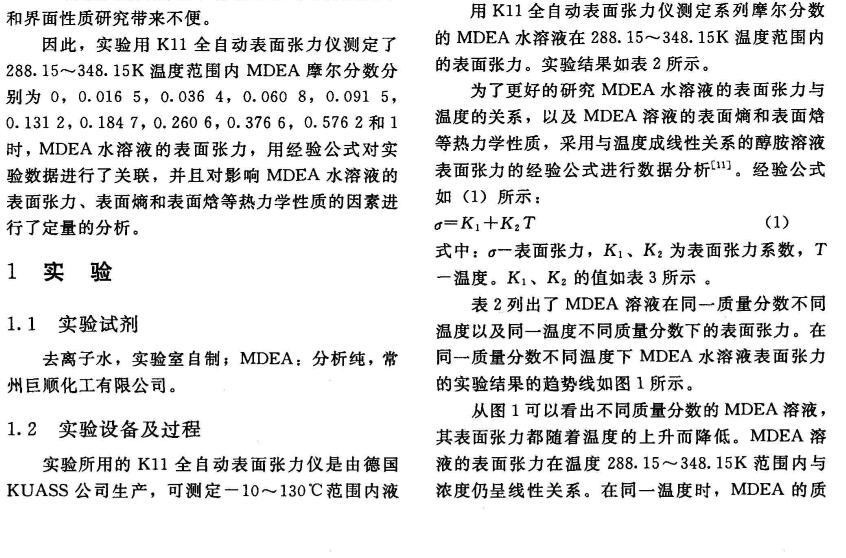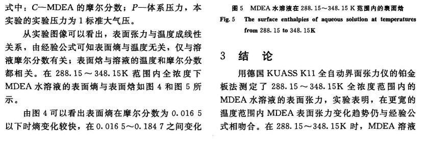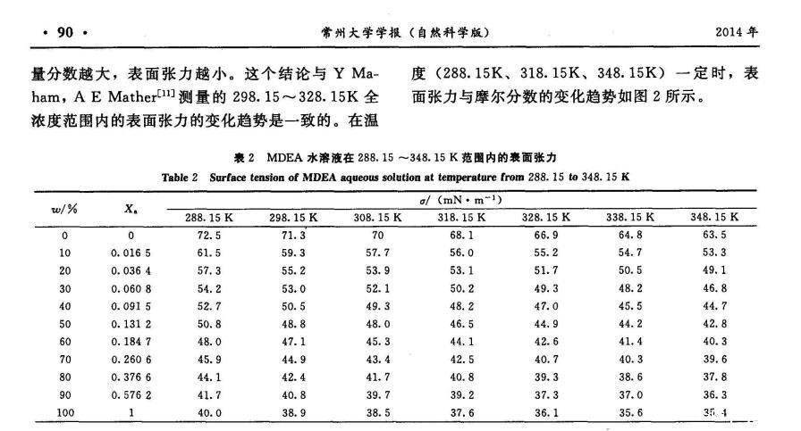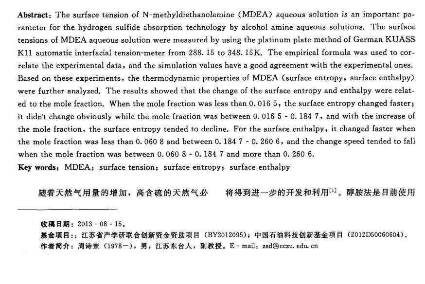 【摘要】:N-甲基二乙醇胺(MDEA)水溶液的表面张力是硫化氢醇胺吸收工艺的一个重要参数。用德国KUASS K11全自动界面18luck国际的铂金板法测定了288.15~348.15K全浓度范围内的MDEA水溶液的表面张力,并用经验公式对实验数据进行了拟合,拟合曲线与实验值吻合良好。在此基础上对MDEA的热力学性质(表面熵,表面焓)进行了进一步分析,结果表明,表面熵在摩尔分数为0.016 5以下时熵变化较快,在0.016 5~0.184 7之间变化不明显,但随着摩尔分数的继续增加表面熵呈下降趋势。表面焓在摩尔分数为0.060 8以下和0.184 7~0.260 6之间变化较快,在0.060 8~0.184 7和0.260 6以上时焓变化趋于缓慢。