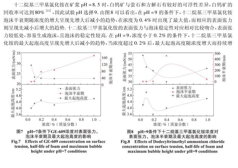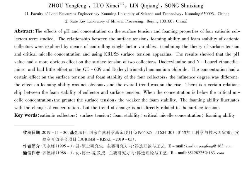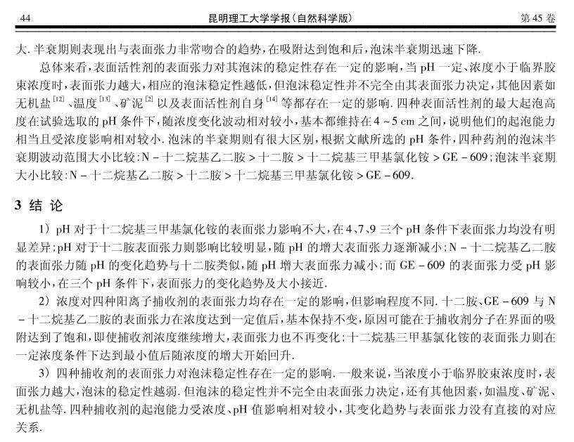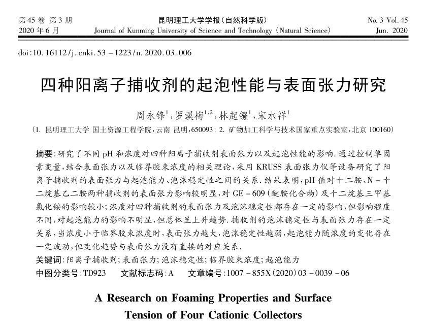 四种阳离子捕收剂的起泡性能与表面张力研究