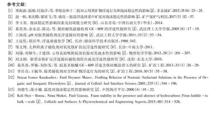 【摘要】:研究了不同pH和浓度对四种阳离子捕收剂表面张力以及起泡性能的影响.通过控制单因素变量,结合表面张力以及临界胶束浓度的相关理论,采用KRUSS表面18luck国际等设备研究了阳离子捕收剂的表面张力与起泡能力、泡沫稳定性之间的关系。结果表明,pH值对十二胺、N-十二烷基乙二胺两种捕收剂的表面张力影响较明显,对GE-609(醚胺化合物)及十二烷基三甲基氯化铵的影响较小;浓度对四种捕收剂的表面张力及泡沫稳定性都存在一定的影响,但影响程度不同,对起泡能力的影响不明显,但总体呈上升趋势。捕收剂的泡沫稳定性与表面张力存在一定关系,当浓度小于临界胶束浓度时,表面张力越大,泡沫稳定性越弱,起泡能力随浓度的变化存在一定波动,但变化趋势与表面张力没有直接的对应关系。