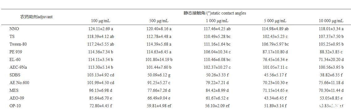 表3不同质量浓度的助剂溶液在小麦叶正面上的静态接触角(mean±SD,n=5)