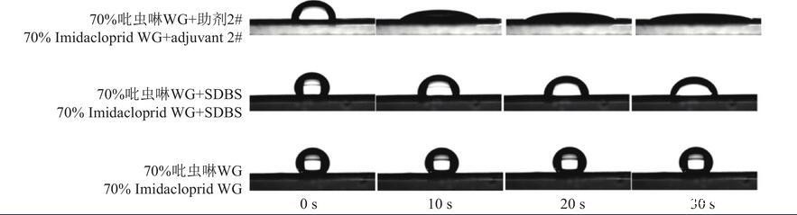 试验过程中发现,添加各供试助剂后的药液液滴在小麦叶片正、反面上的展布行为基本相似,但展布的速率和面积不同,因此以加入助剂2#和SDBS的吡虫啉药液在水平放置的小麦叶片上的铺展情况(图4、5)为例,说明添加不同助剂后药液在小麦叶片上的铺展行为。药液液滴以零速度放置于小麦叶片上,长轴方向平行于叶脉,展布速度较快,短轴方向垂直于叶脉,展布速度较慢,且铺展面积在20 s左右趋于稳定。由图4、5可知:添加了助剂2#的药液因其表面张力下降至21.98 mN/m,小于小麦叶片正反面的表面张力,可以在小麦叶片润湿展布,随时间变化接触角减小,展布程度增大;而添加了SDBS助剂和未添加助剂的药液表面张力大于小麦叶片的表面张力,在小麦叶片上不铺展或铺展速度较慢。在农药使用过程中,药液在小麦叶面上的展布性越好,铺展的面积就越大,相应的防治面积也就越大,药液黏附于作物叶面上的可能性就越大,从而减少了农药流失进入环境的概率,大大地提高农药利用率和施药效果。
