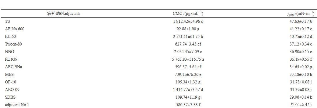 从表2中可见:不同种类的助剂具有不同的临界胶束浓度(CMC)和临界胶束浓度时表面张力(γcmc),与其对照(水)相比各助剂临界胶束浓度时的表面张力均小于水的临界表面张力[(72.75±0.01)mN/m],并存在显著性差异。其中,助剂1#、2#和4#当质量浓度达到CMC时表面张力的降低率在72.63%~69.75%,助剂4#的效果最好,其次是助剂1#和2#,临界表面张力分别是(19.91±0.11)、(20.00±0.01)和(22.00±0.42)mN/m。而自制的助剂3#以及目前农药生产上应用较为广泛的常规绿色助剂十二烷基苯磺酸钠(SDBS)、烷基酚聚氧乙烯醚(OP-10)、Tween-80和农乳600#等与助剂1#、2#和4#相比,对水表面张力的降低能力稍弱,但在P<0.05水平上差异显著性分析表明均显著低于水的临界表面张力。茶皂素对水的表面张力影响最小,临界表面张力为(47.63±0.17)mN/m,降低率仅为34.53%。