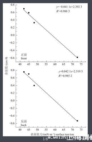 临界表面张力是固—液界面化学中表征固体表面能的一个重要指标,用以说明液体在固体表面的可润湿性。通过ZISMAN图法[22]以接触角的cosθ对液体表面张力作图得到接触角与表面张力的回归直线如图1所示:求得方程分别为y=−0.041 1 x+2.392 3和y=−0.042 1x+2.519 5。将图中直线外延至cosθ=1处,得出小麦叶片正、反面的临界表面张力值分别为33.88和36.08 mN/m,与顾中言等[21]研究结果几乎一致。从测定结果可以看出:小麦叶片的反面表面张力值比正面大,更容易被润湿;但小麦叶片正、反面的表面张力估值较小,即表面自由能较低,较难被润湿。