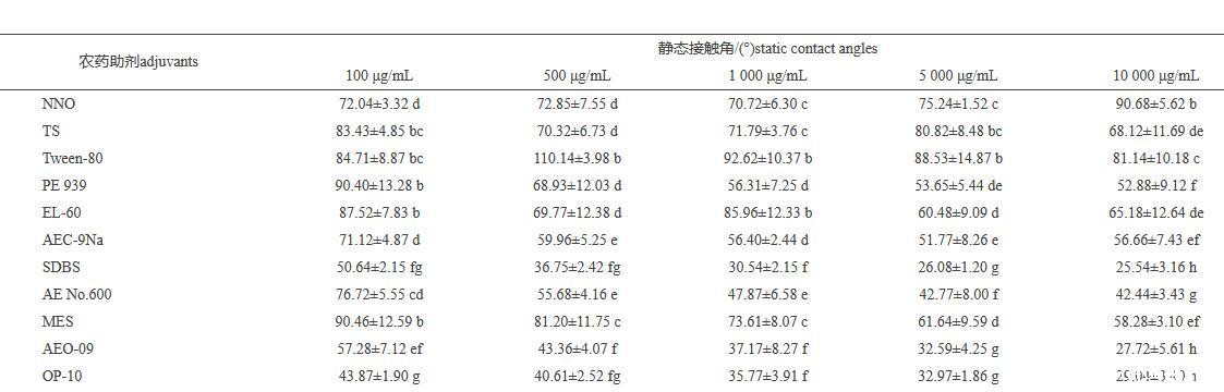 2.3不同质量浓度的助剂溶液在小麦叶面上的静态接触角